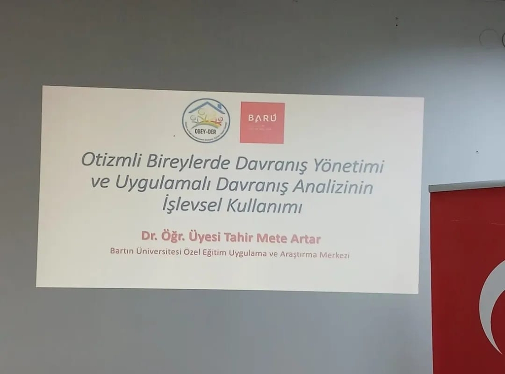 Bartın Otizimli ve Özel Gereksinimli Bireyler Eğitim ve Yaşam Derneği'nin T.C. İşişleri Bakanlığı Sivil Toplumla İlişkiler Genel Müdürlüğü'nce desteklenen "Yarınım İçin Yanımda" projesi kapsamında planlanan Aile Eğitimi Seminerleri'nin dördüncüsü Davranış Yönetimi ve Uygulamalı Davranış Analizinin İşlevsel Kullanımı başlıklı sunumla, 40 ebeveynin katılımıyla gerçekleştirildi.Sekiz oturum boyunca sürecek ve merkezimizde görevli öğretim elemanlarınca yürütülecek seminerlerin dördüncü oturumu merkez müdürümüz Dr. Öğretim Üyesi Tahir Mete ARTAR  tarafından özel gereksinimli bireylerin  davranışlarının yönetilmesi,kurallar ve olumlu davranış iklimi oluşturma konusunda bilgilendirmeler yapılarak tamamlandı.Örnek uygulamalardan bahsedildi.