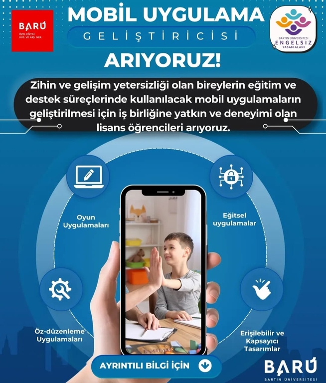 Zihin yetersizliği, otizm, dikkat eksikliği ve hiperaktivite bozukluğu gibi tanı alanlarındaki bireylerin eğitimlerinde kullanılacak mobil uygulamaların geliştirilmesi için takım kuruyoruz. Seni de aramıza bekliyoruz!