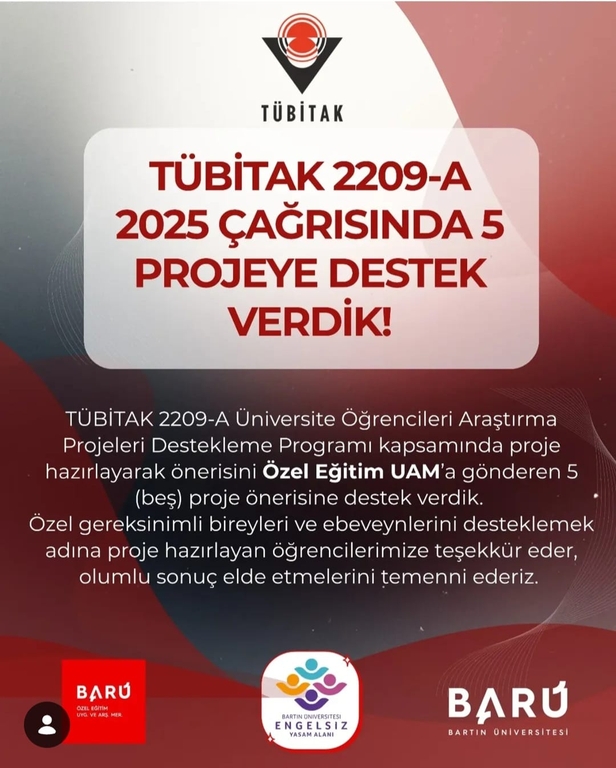 TÜBİTAK 2209-A Üniversite Öğrencileri Araştırma Projeleri Destekleme Programı kapsamında proje hazırlayarak önerisini Özel Eğitim Uygulama ve Araştırma Merkezi'ne gönderen 5(beş) proje önerisine destek verdik.Özel gereksinimli bireyleri ve ebeveynlerini desteklemek adına proje hazırlayan öğrencilerimize teşekkür eder, olumlu sonuç elde etmelerini temenni ederiz.